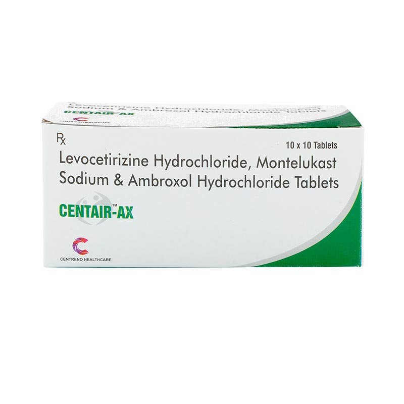 Centair-AX is a combination of three medicines usually prescribed for the prevention of Asthma. Ambroxol is a mucolytic which thins and loosens mucus (phlegm), making it easier to cough out. Levocetirizine is an antiallergic which relieves allergy symptoms like runny nose, watery eyes and sneezing. Montelukast is a leukotriene antagonist. It works by blocking the action of leukotriene, a chemical messenger. This reduces inflammation in the airways and nose and improves your symptoms.